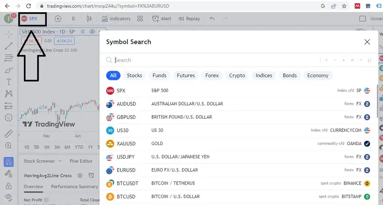 Para elegir un activo en TradingView, presione el icono en la esquina superior izquierda de la pantalla. A continuación, aparecerá una ventana para buscar los activos comerciales deseados. Vea la imagen a continuación: