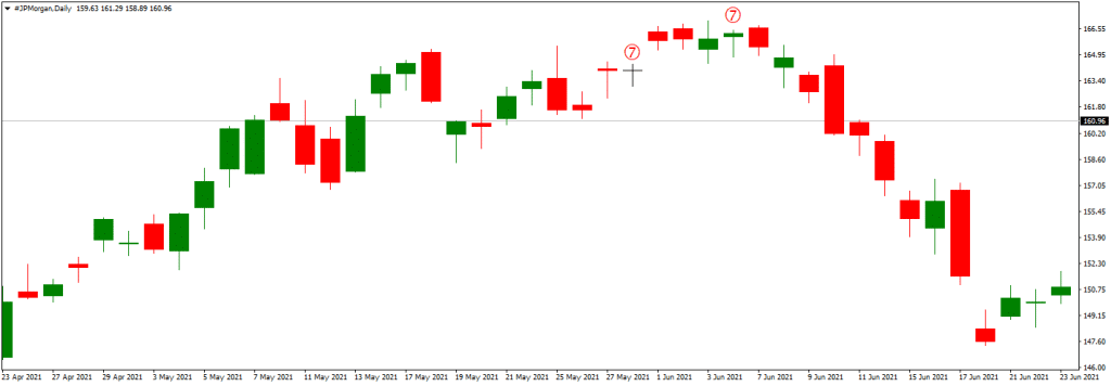 The instance features Morgan Stanley, holding 12 signals in a span of fewer than three months. The arrows in blue show the narrow range candlestick, and under it, the thin lines in blue display both the highs and lows of the range. The moves on the next day that are on a high are bullish, whereas the moves on the next day that are low are bearish. First, you must identify that the days of the NR7 are formed constantly across three different moments.