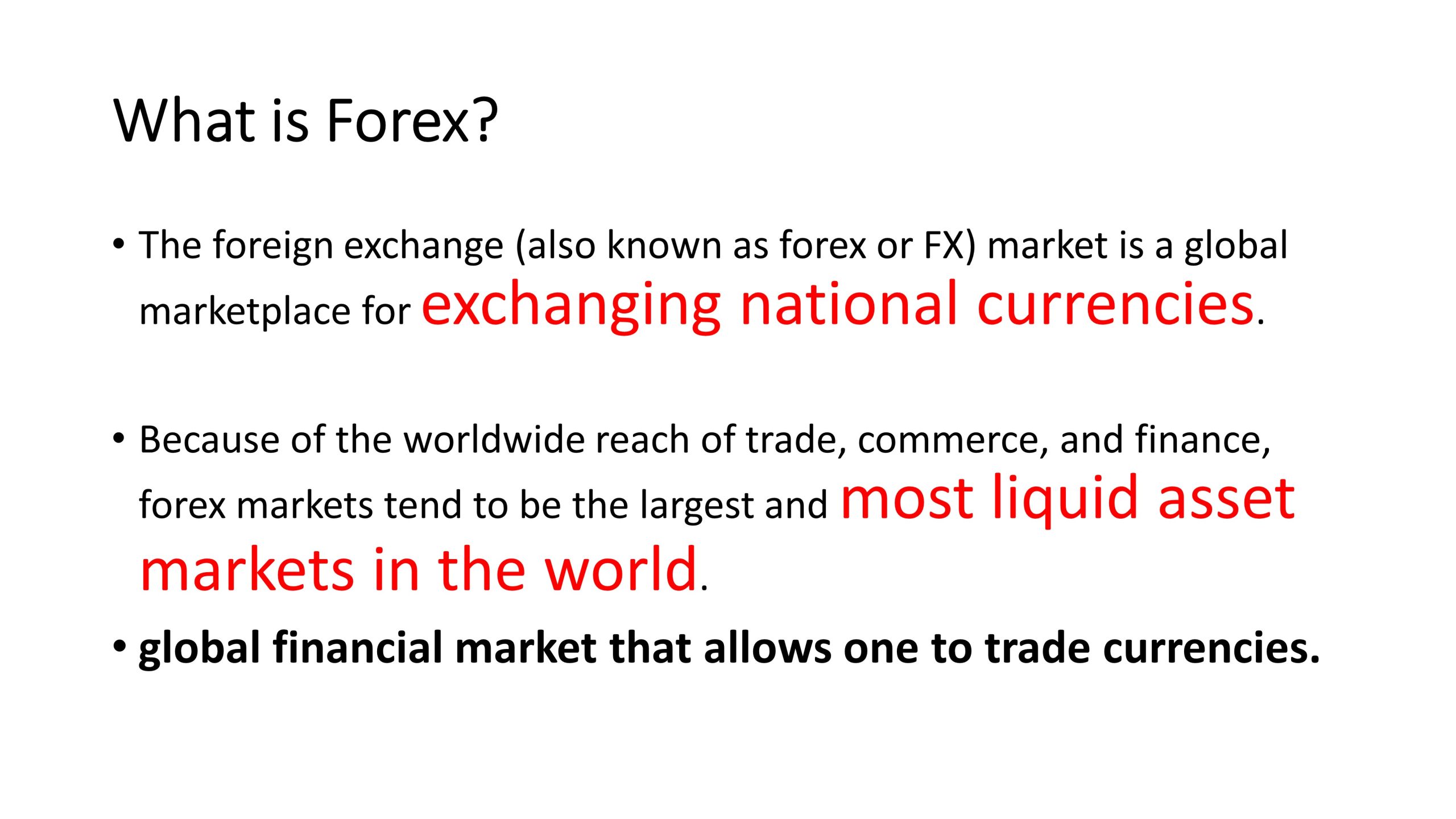 Forex or foreign exchange represents the largest and most liquid asset global marketplace for exchanging national currencies against one another. In the foreign exchange process, traders change one currency into another currency for commerce, trading, or tourism.